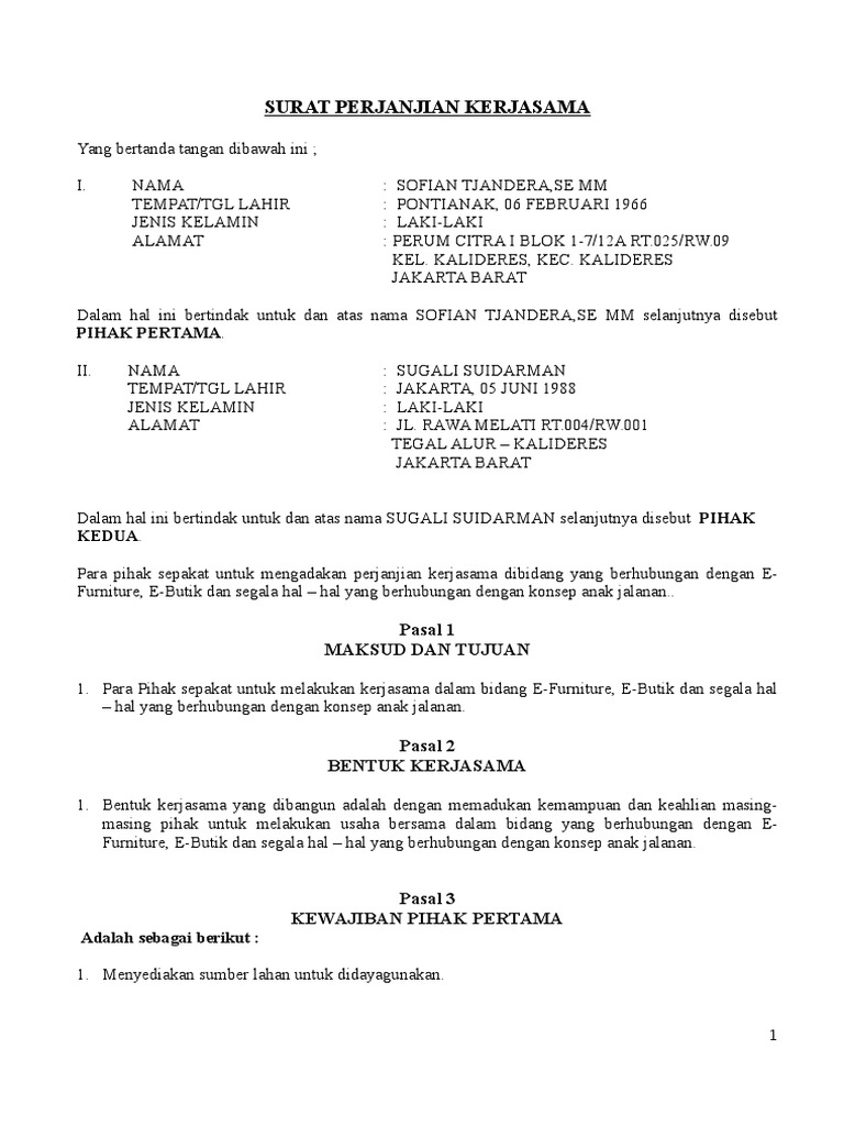 Perjanjian Kerjasama from imgv2-1-f.scribdassets.com Surat kontrak kerjasama usaha merupakan dokumen yang bersifat fundamental dalam jalinan kerjasama antar bisnis. Nah, buat anda yang hndak mengadakan perjanjian kerja sama dengan pihak lain, anda perlu menyiapkan ketentuan tentang isi kerja sama. Contoh surat perjanjian kerjasama, jual beli barang, kontrak kerja. Pentingnya kontrak kerjasama untuk mengembangkan usaha anda posted on 09 oktober 2020 · by kontrak hukum sebagai makhluk sosial, kita tidak dapat hidup sendiri dan memerlukan bantuan orang lain untuk memenuhi kebutuhan hidup. Contoh sop kerjasama bisnis pertama yang saya sajikan adalah standar operasional prosedur tata cara kontrak kerjasama. Budidaya burung doc contoh surat perjanjian kerja. Contoh surat pemutusan kontrak kerjasama antar perusahaan have an image from the other.contoh surat pemutusan kontrak kerjasama antar perusahaan in addition, it will include a picture of a sort that may be seen in the gallery of contoh surat pemutusan kontrak kerjasama antar perusahaan. Surat perjanjian kerjasama usaha pertanian komoditas brokoli nomor.